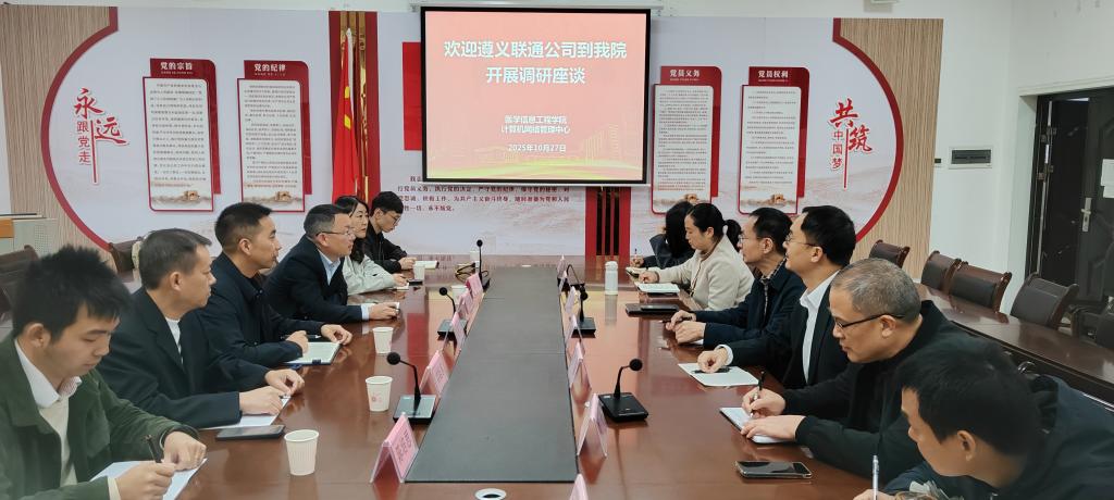 2025年10月27日,中国联通遵义分公司总经理兰宣豪一行6人赴公司开展座谈,围绕员工实习、科研项目申报、实验室共建、智慧校园建设等领域展开深入交流。公司党委书记李岩,副经理罗旭,党委副书记刘畅及校计算机网络管理中心副主任张干,员工办、教务科相关负责人出席。党委副书记、经理王晓华主持会议。