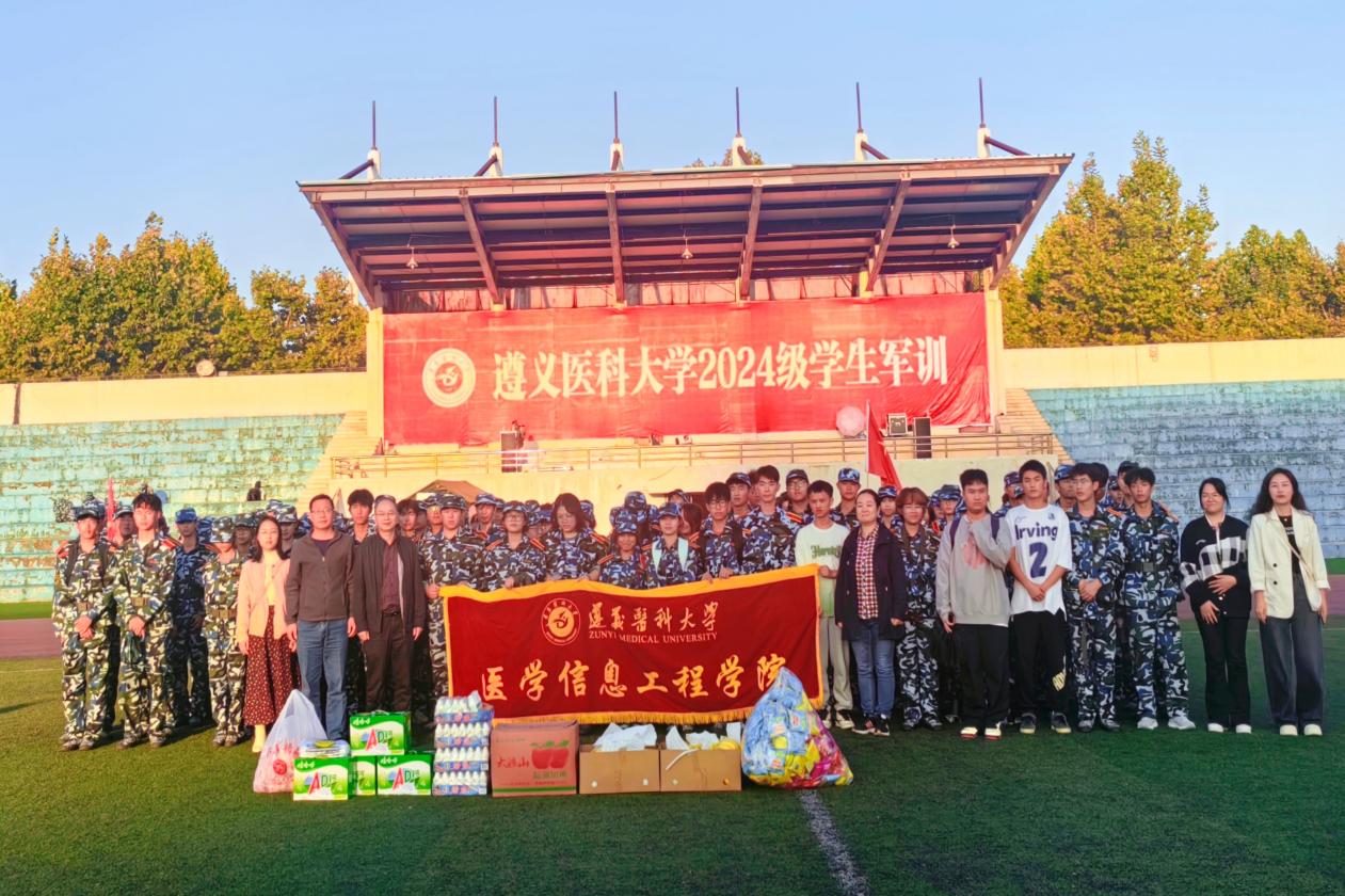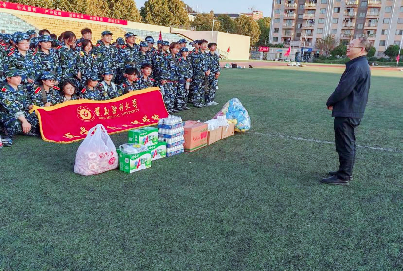 中午,新生兼职班主任完成了慰问物资的采购与清点。下午5点30,医学信息工程公司党委书记李岩、副书记刘畅、辅导员冉姣老师及员工代表携带慰问物资来到北区体育场,对正在参训的新生进行慰问。