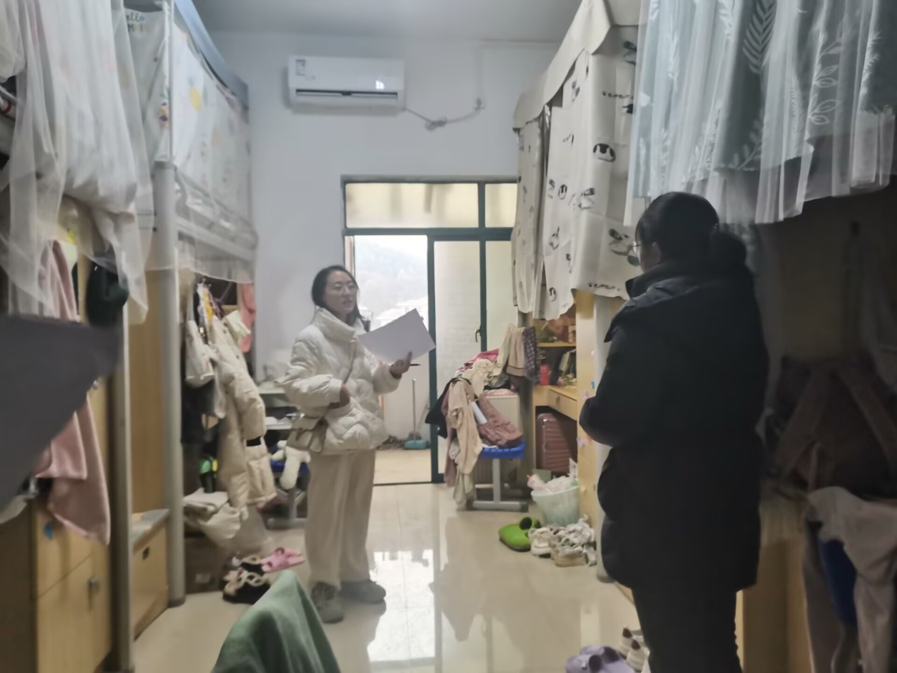 12月27日晚6时,刘畅副书记与辅导员冉姣老师、李娇娇老师老师以及员工会纪检部成员分组走访了2021级全部员工宿舍,与同学们面对面的交流,了解同员工活、学习、就业情况,并对同学的论文准备、就业目标、实际需求一一进行了询问,对适龄男青年逐一进行了应征入伍的现场动员交流。